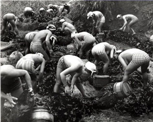 The growing respect with increasing age was derived from the skilled free diving technique the Ama practiced, when they held their breath for the entire time it took to complete a dive, usually about two minutes. No scuba gear or oxygen tanks for these women! As the age of individual divers increased, so did their ability to hold their breath for increasing lengths of time, thereby increasing the length of time they could stay underwater during a single dive. With each plunge to the beds, located some 30 feet below the surface, the Ama would return with the oysters they pried loose, placing them in baskets tethered on the water’s surface. Once baskets were full, the divers returned to shore and began the painstaking task of prying open the bi-valve shells in search of precious pearls.