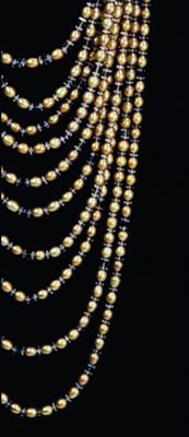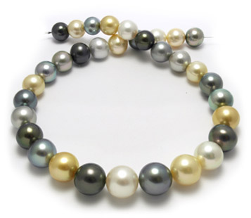 A strand showing the naturally-occurring color variation of cultured South Sea pearls.